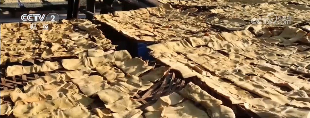记者走进田林县六隆镇就闻到浓浓的笋香。经过几个月的自然发酵,扁平、泛白的八渡笋被村民从笋仓中取出,在阳光下自然晾晒,各家房前屋后铺满了金灿灿的八渡笋笋干。