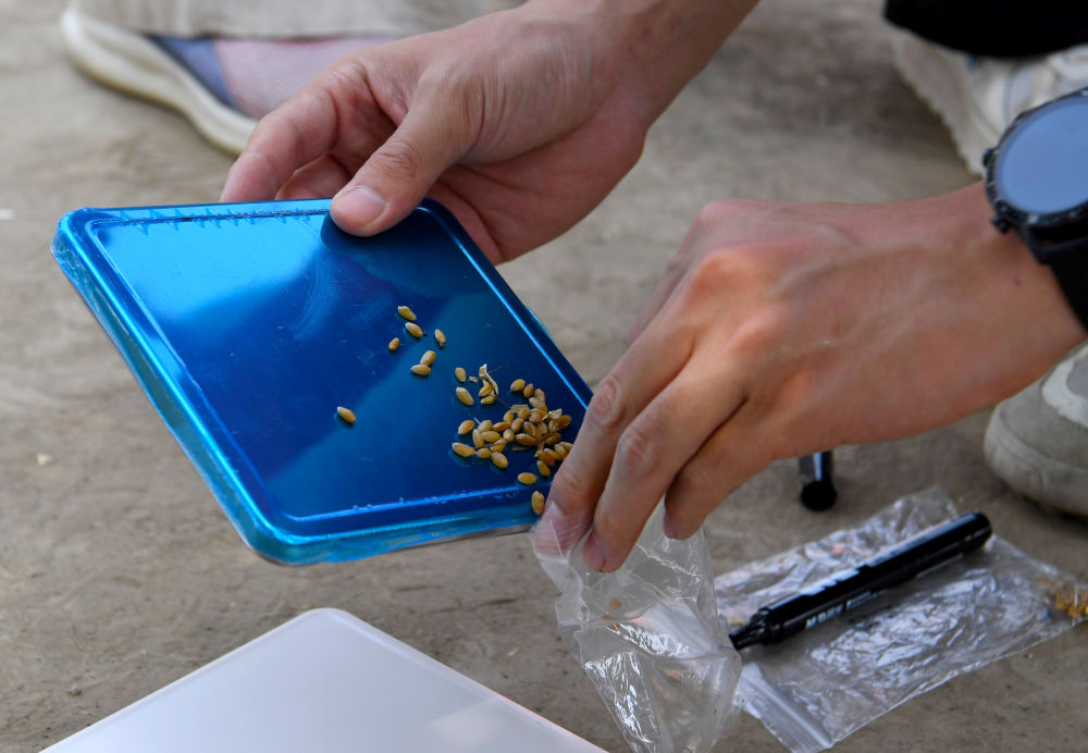 5月28日,在河南省周口市商水县举行的小麦机收减损技能大比武活动现场,工作人员在选定的采样区域捡拾掉落的麦粒。新华社记者郝源 摄