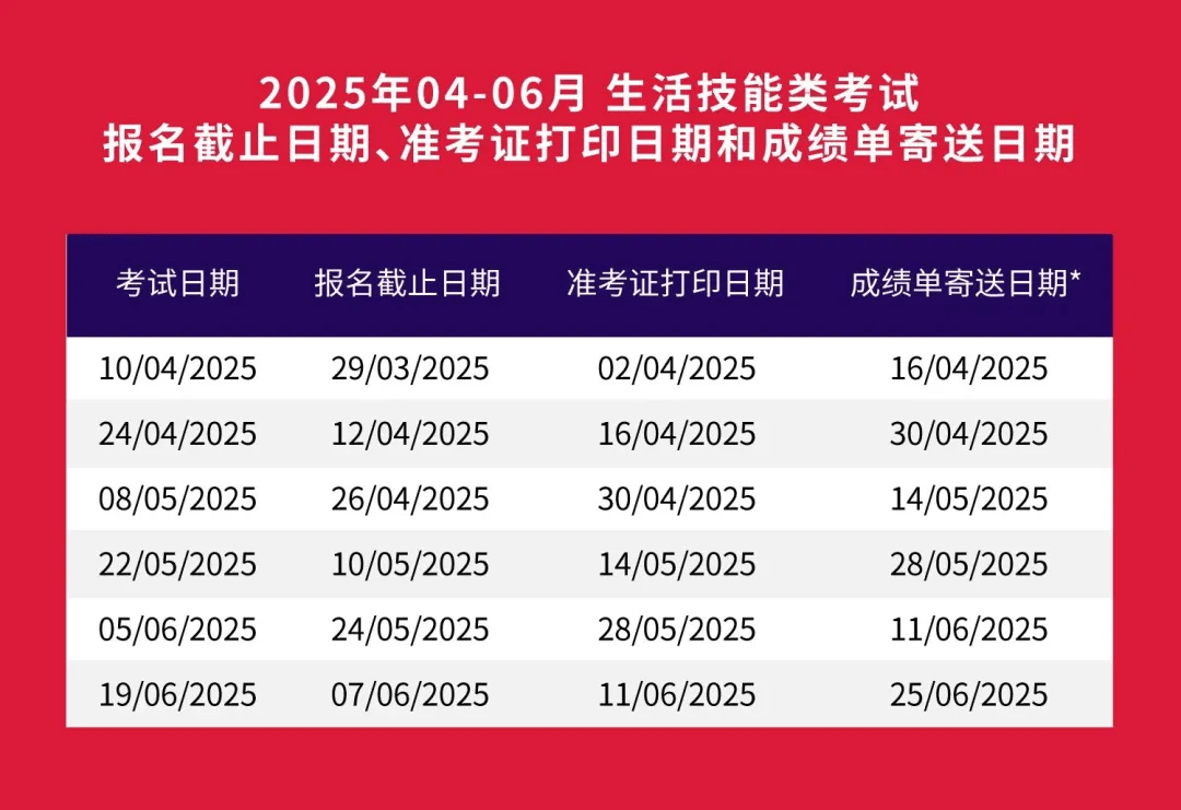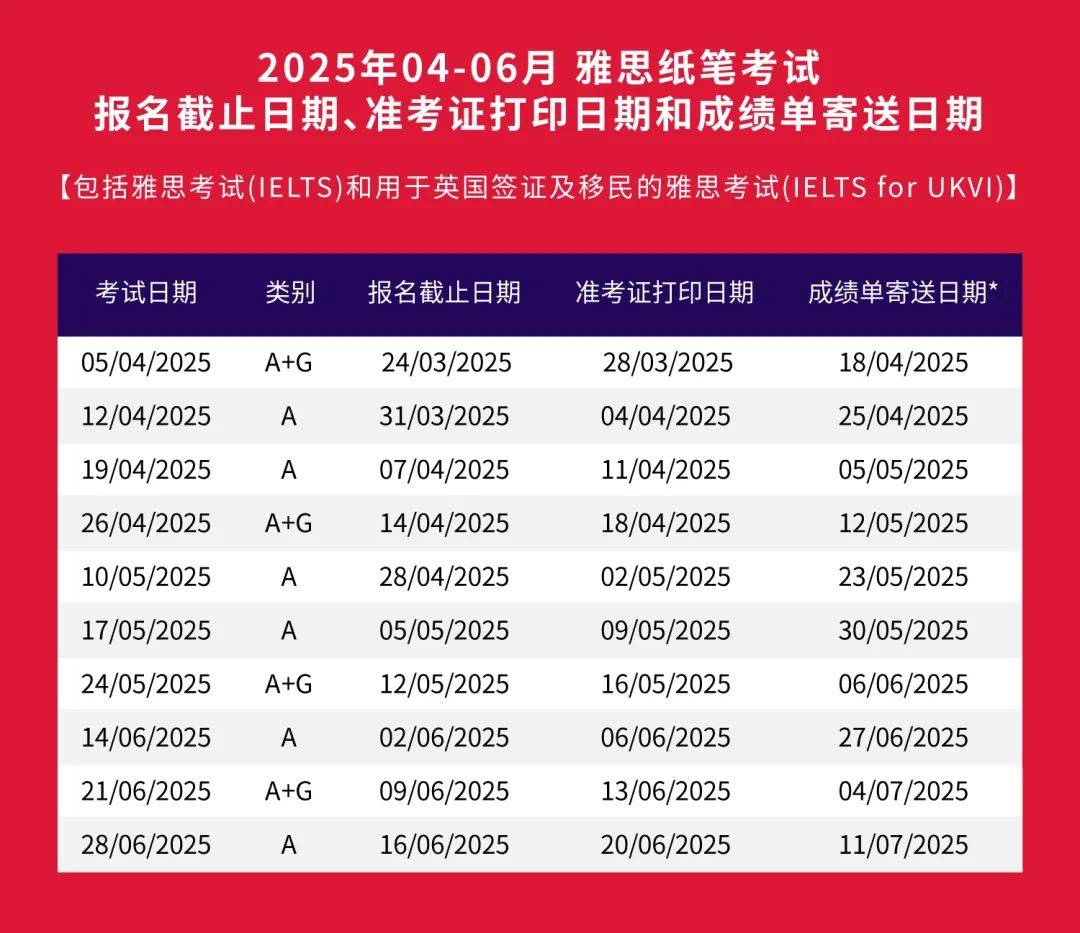 具体包括2025年4-6月用于英国签证及移民的雅思纸笔考试和机考、2025年4-6月雅思机考的报名截止日期、准考证打印日期和成绩单寄送日期。