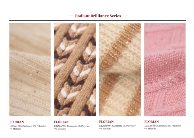 「CASHMORIA 1.0」新品融合了高质量羊绒、天然蚕丝、亚麻,以及金银丝、珠片等潮流元素,通过起毛、圈圈纱、3D 立体结构等纺纱技术,呈现出更为多元、前卫的产品风格,为设计师及品牌提供广阔创作空间。全新10组羊绒花式纱线现已问世,涵盖四大主题概念。